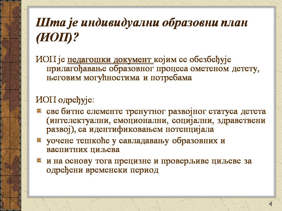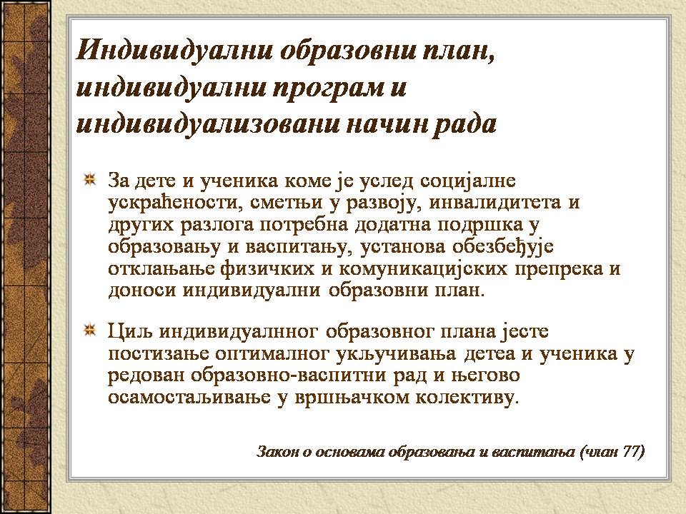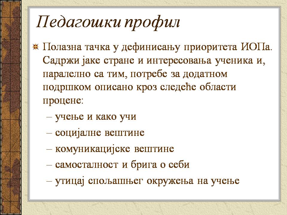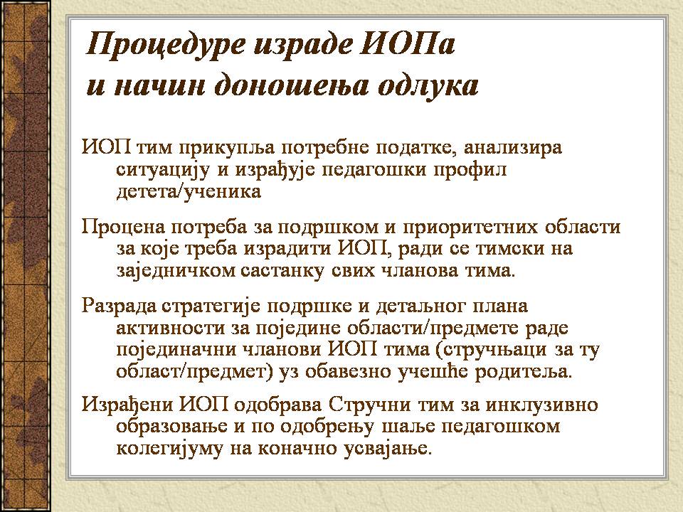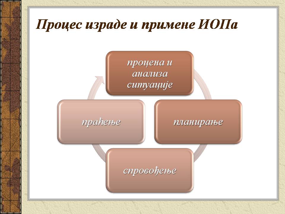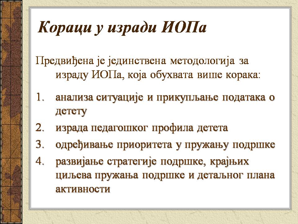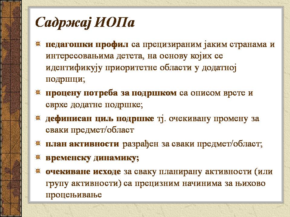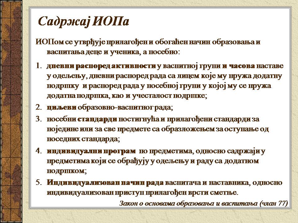 Темпо рада, дневни распоред и садржај активности у областима обухваћеним ИОП-ом усклађени су са нивоом тренутних постигнућа и са зонама наредног развоја појединачног ученика.