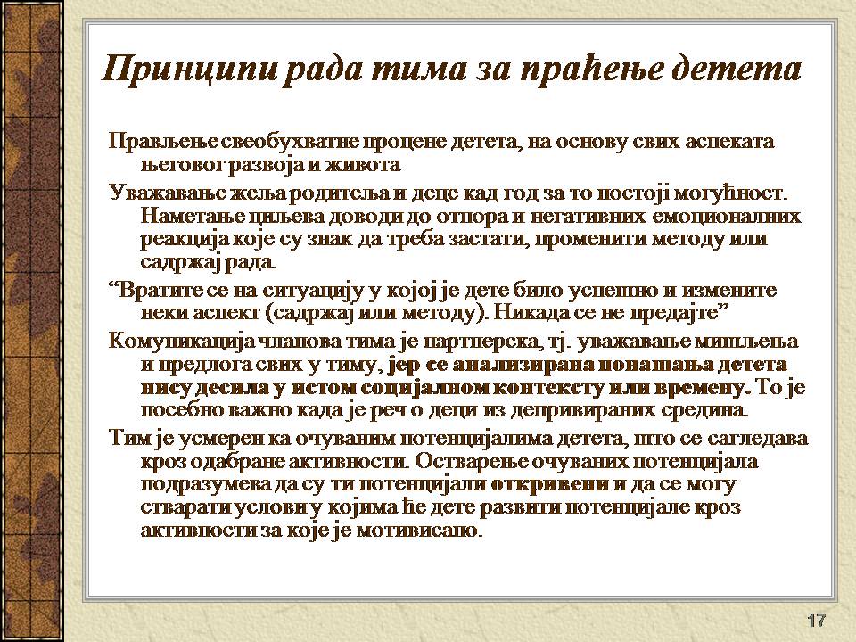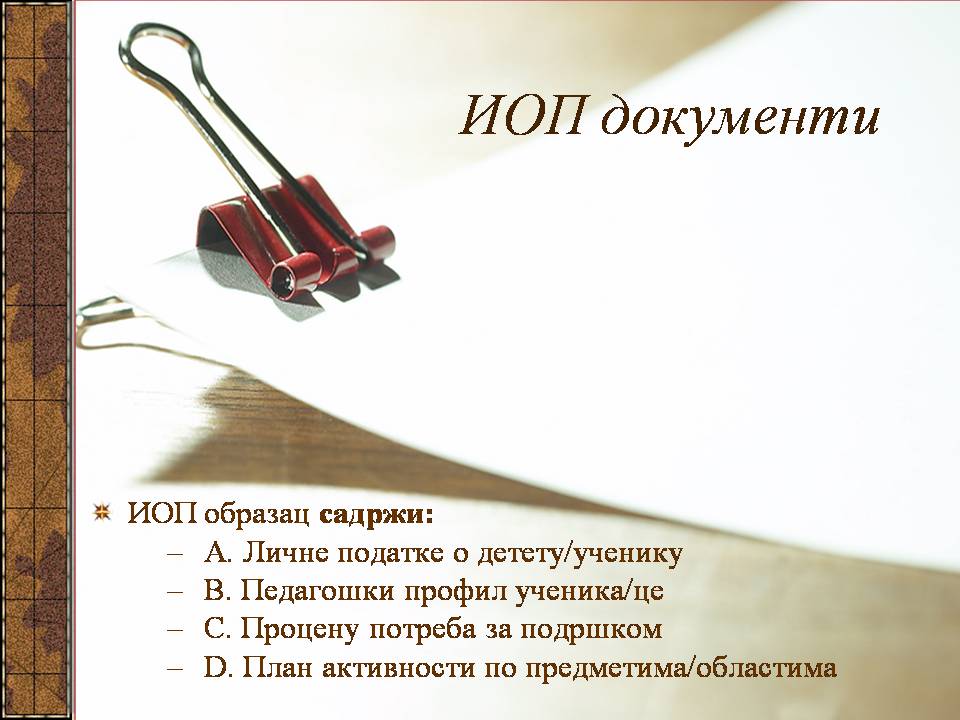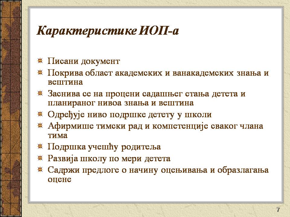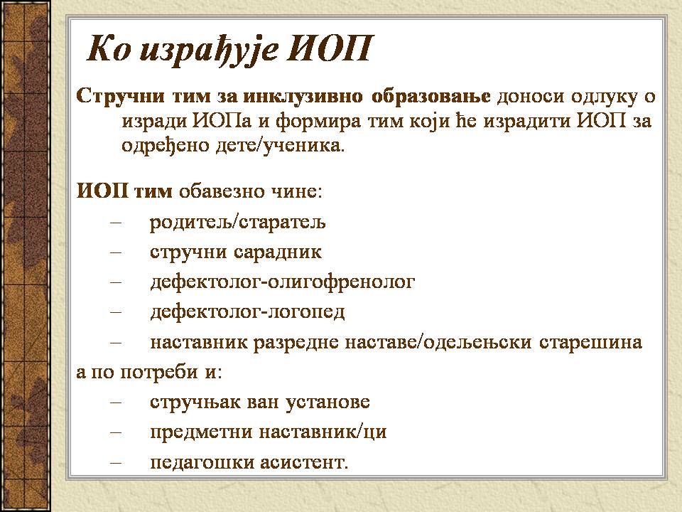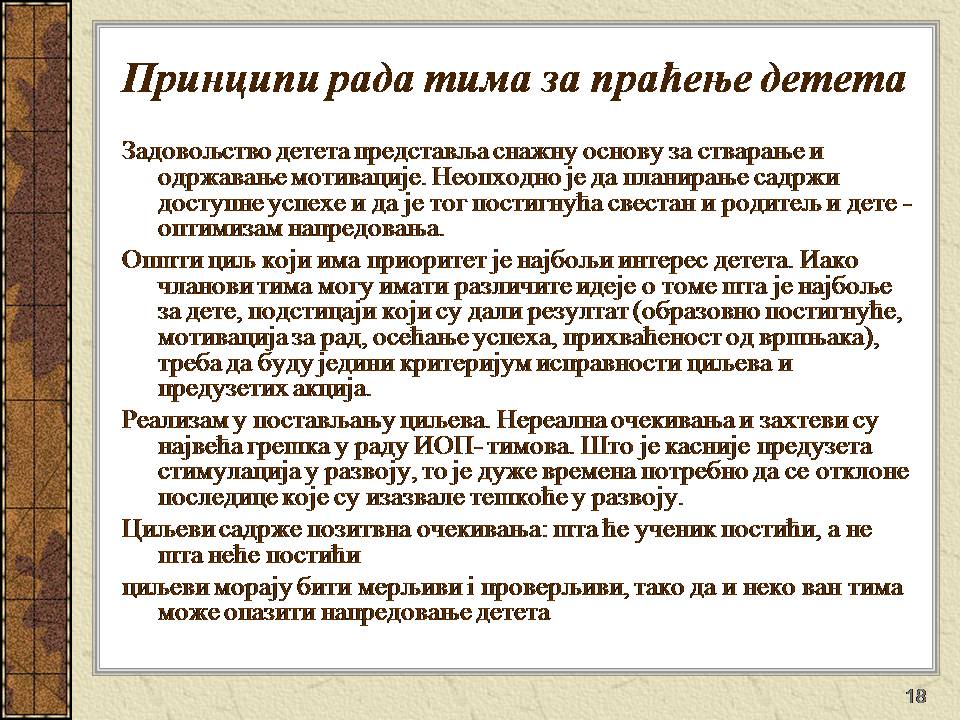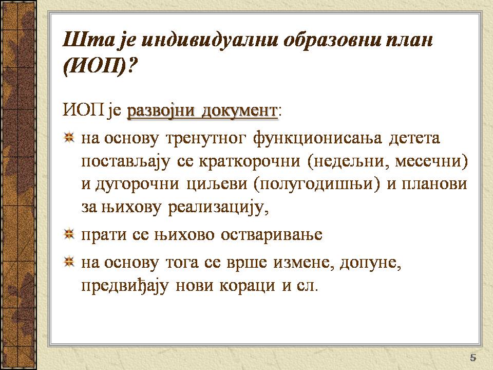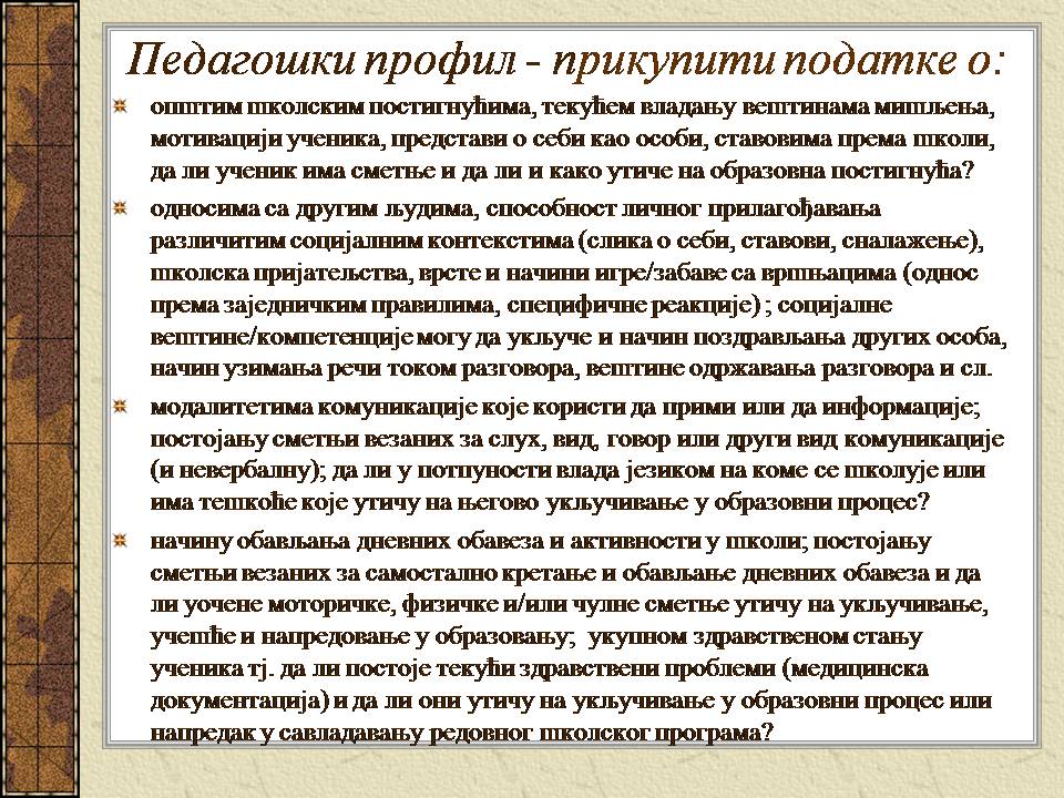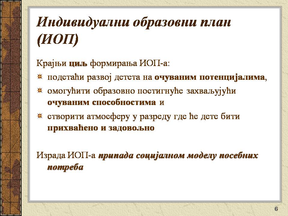 Темпо рада, дневни распоред и садржај активности у областима обухваћеним ИОП-ом усклађени су са нивоом тренутних постигнућа и са зонама наредног развоја појединачног ученика.