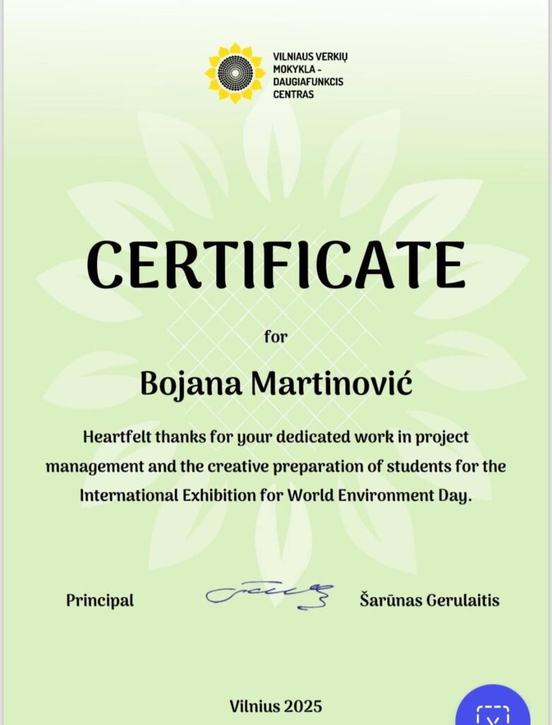 Марија Кљештан, ученица трећег разреда, учествовала је, уз подршку наставнице Бојане Мартиновић, на интернационалној виртуелној изложби креативних радова ученика са сметњама у развоју“ The Earth in my hands“ , у организацији Vilnius Verkiai school- Multifunctional center из Литваније. Изложба је организована поводом Дана планете Земље. Слике радова су објављене на сајту поменутог центра.