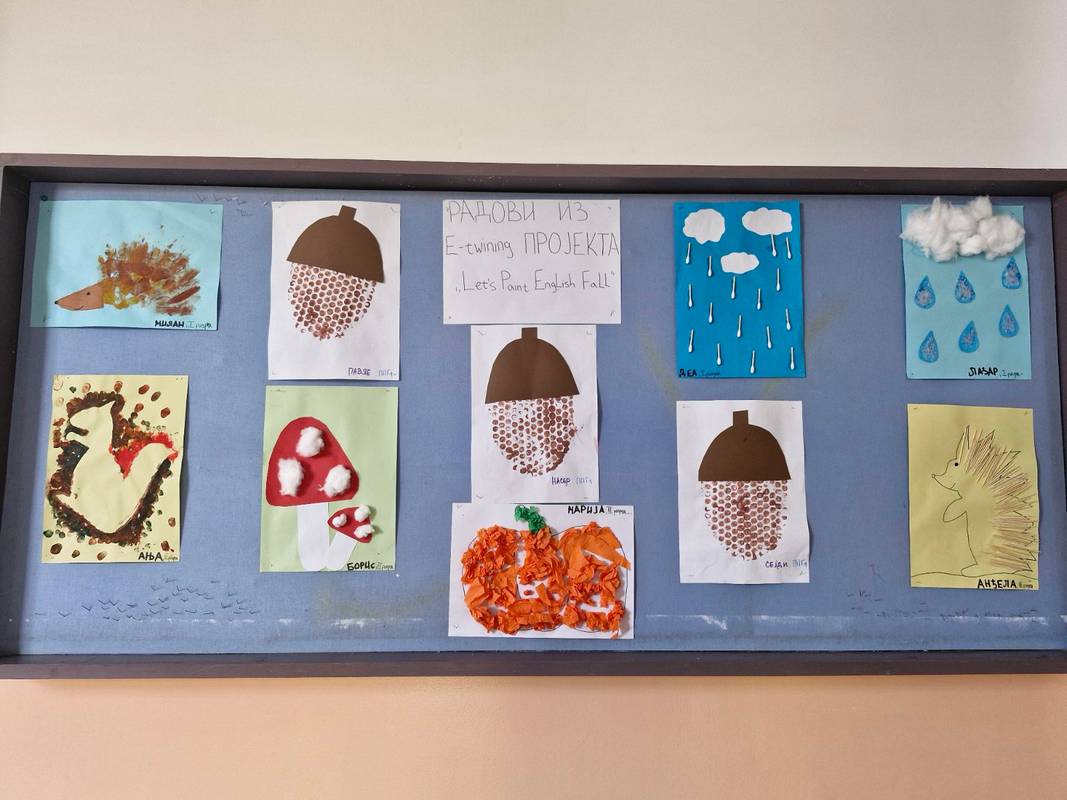 У оквиру eTwinning пројекта „Let’s Paint English Autumn“ ученици припремно-предшколске групе 1, првог, другог и трећег разреда направили су различите радове на тему јесени. Учествовали су у бојењу према бројевима, у учењу појмова везаних за јесен на српском и енглеском језику, користили различите материјале и технике. Радови наших ученика представљени су партнерима у овом пројекту који су из Пољске, Литваније, Шпаније, Италије, Хрватске, Румуније, Грчке, Естоније, Португала и Молдавије.