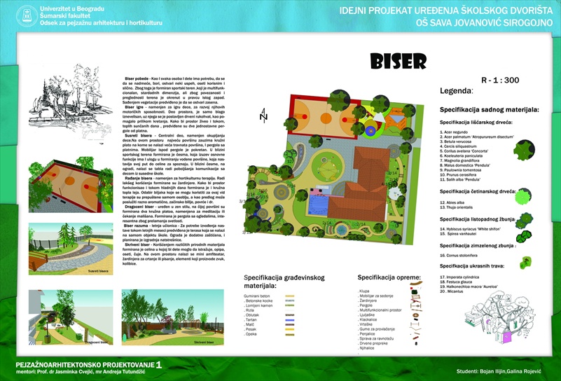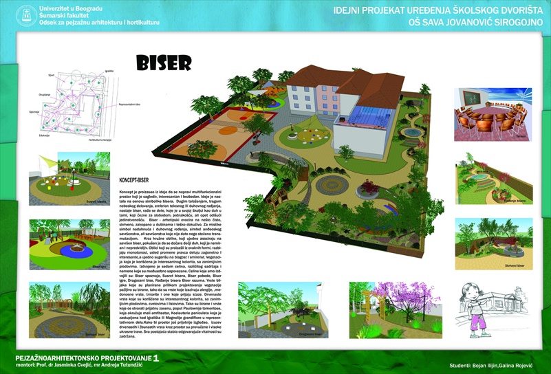 Дана 8.12.2011. год. у просторијама Шумарског факултета, заседао је стручни жири чији су чланови имали тежак задатак да од мноштва квалитетних и занимљивих идејних решења, представљеним кроз пројекте студаната треће године одсека за пејзажну архитектуру, одаберу решење које би највише одговарало будућем изгледу дворишта школе. После дугог већања, донета је одлука да за решење уређења буде одабрана комбинација два рада: „Бисер“ и “ Звездана прашина“, честитамо ауторима и радујемо се сарадњи.