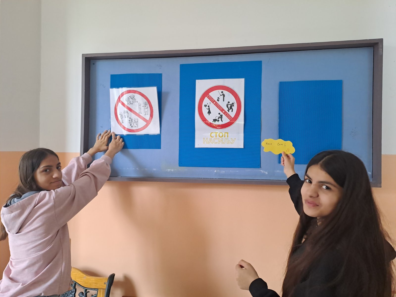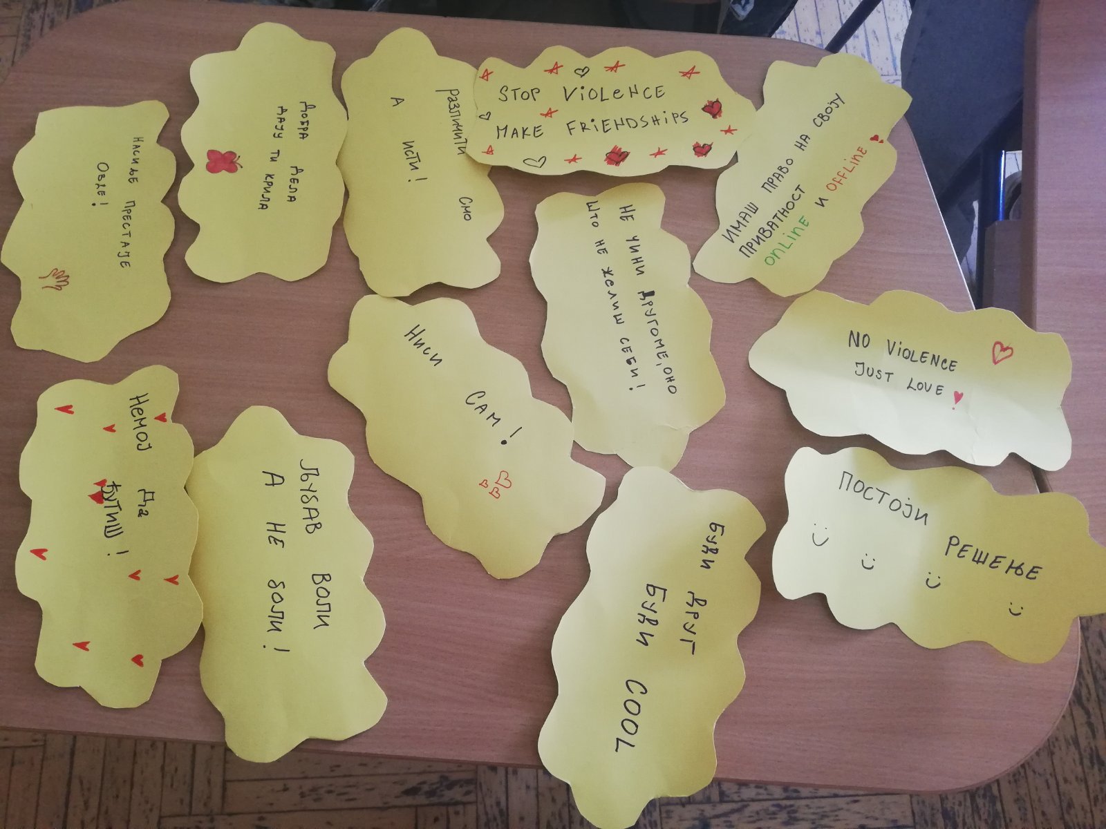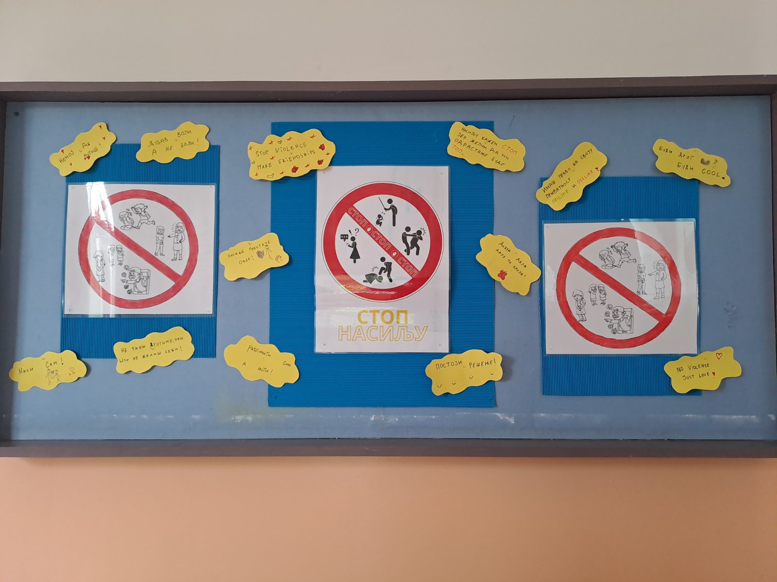 На радионици је урађено постер СТОП НАСИЉУ који је подељен свим разредима, ППГ, развојна група и индивидуалним наставницима. За пано су направљени постери на задату тему и израђене су поруке против насиља, све је представљено на паноу.