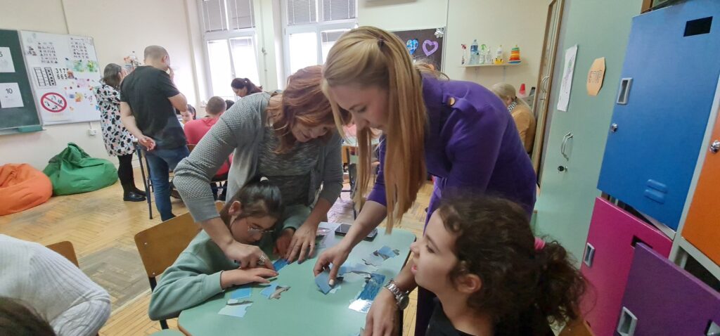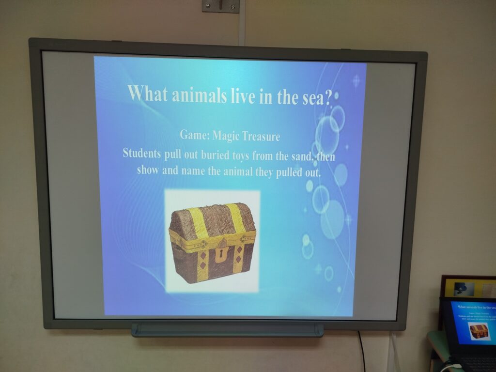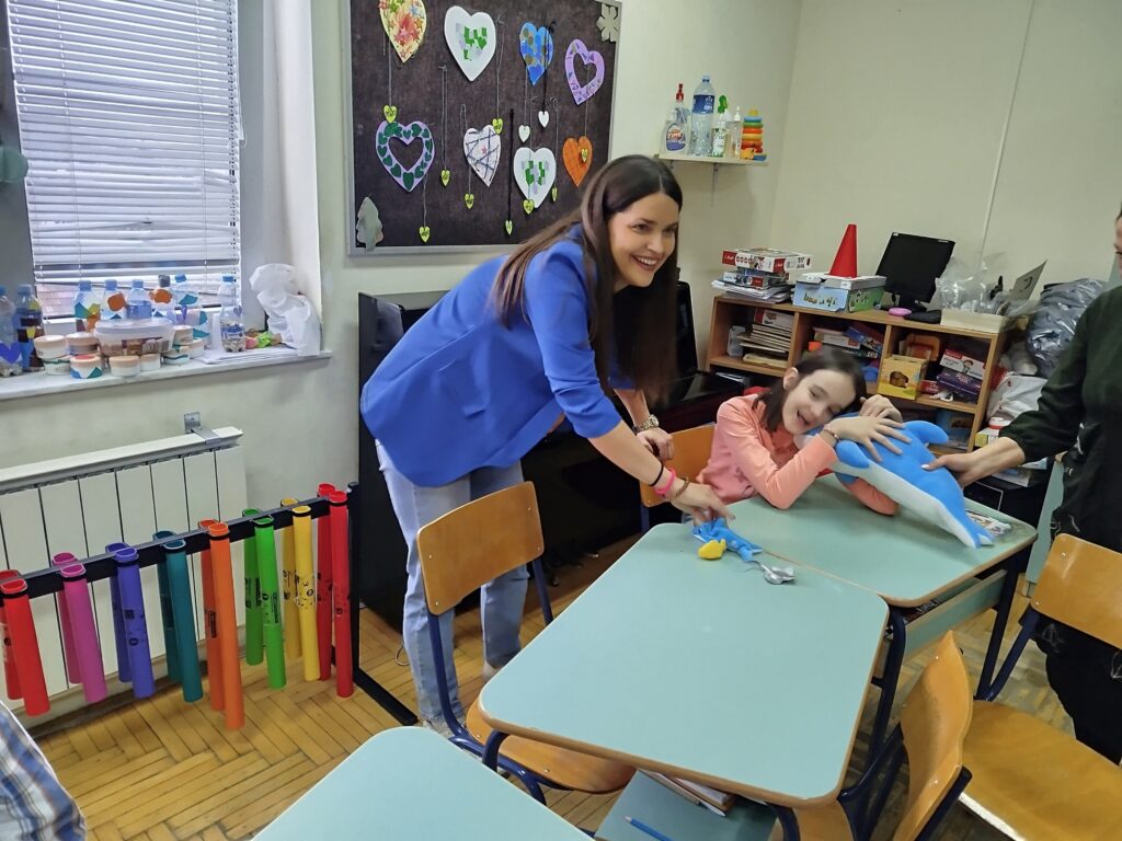 Разговарали смо о томе које све животиње живе у мору-кроз игру чаробно благо, шта су делфини, како изгледају, где живе, чиме се хране, како се крећу, како се оглашавају. Слагали смо слагалицу делфина, имитирали смо њихове покрете и оглашавање, правили смо радове од различитих материјала на задату тему. Радионицу смо завршили у добром расположењу, пратећи уз покрет песмицу: „Under the sea“.
