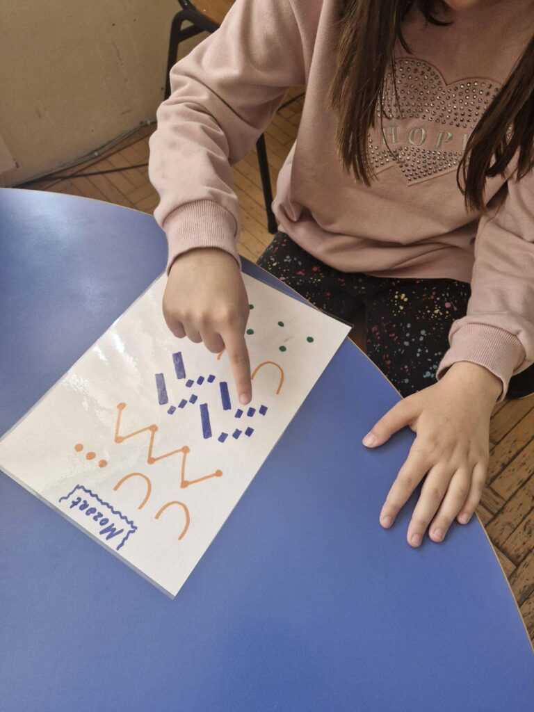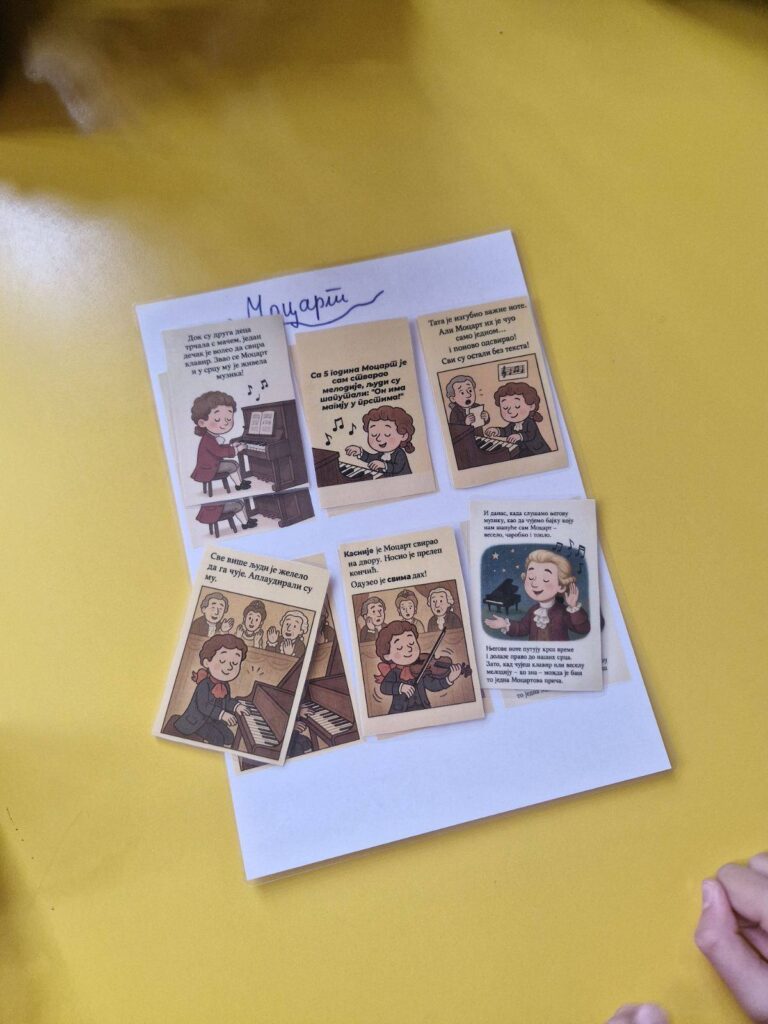 Кроз илустровану причу, слушање музике, покрет, плес, певање и креативно изражавање, деца су упознала живот и стваралаштво Моцарта. Ученици су били веома заинтересовани за пројекат и радо су прихватили све активности. Са великим ангажовањем и уживањем су учествовали у музичким, ликовним и покретним садржајима.